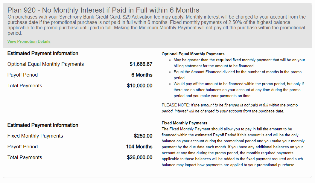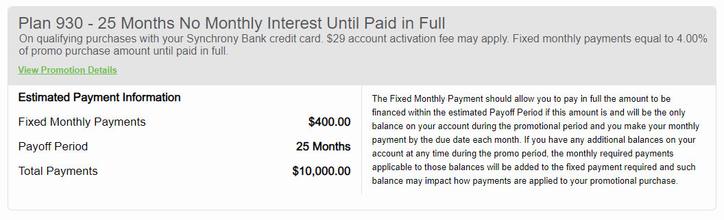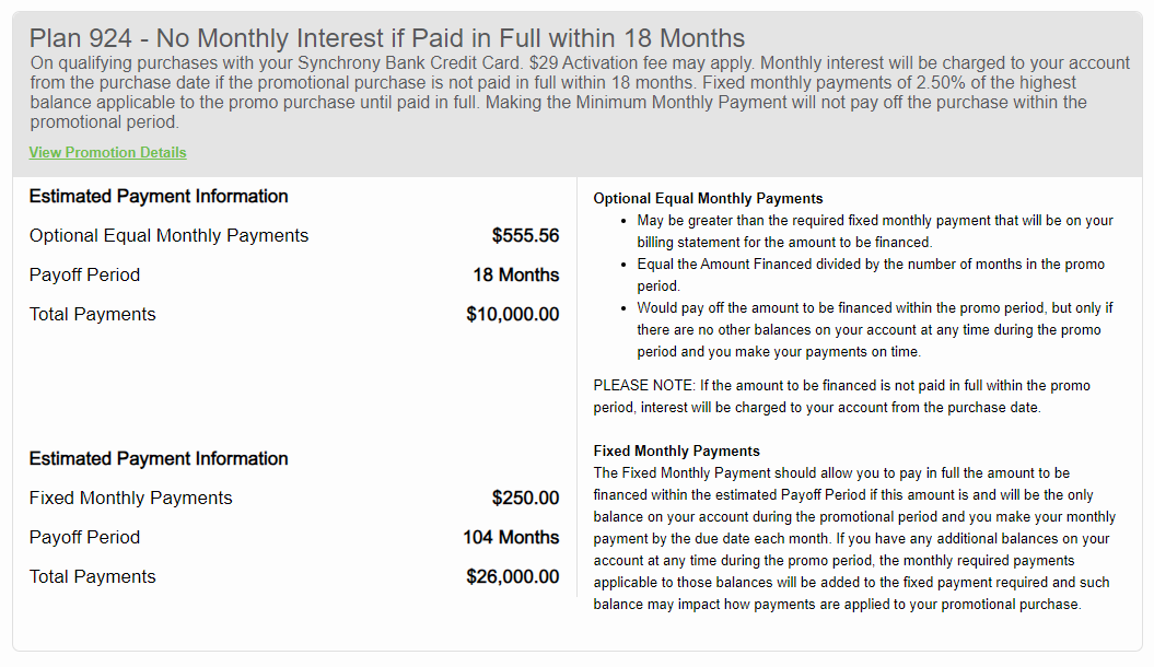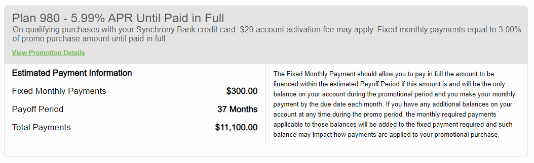 Please scan this QR code with the camera on your smart phone to start the quick and easy application process for financing your Generator Project with TriStar Electric. Or reach out to TriStar Electric and provide your email address and TriStar Electric will send you an email from Synchrony Financial where you can follow the link within to securely complete the application. Once you are approved by Synchrony, and have received the card in the mail, please reach out for an quote and select the plan that works best for you. Please see plans listed below.